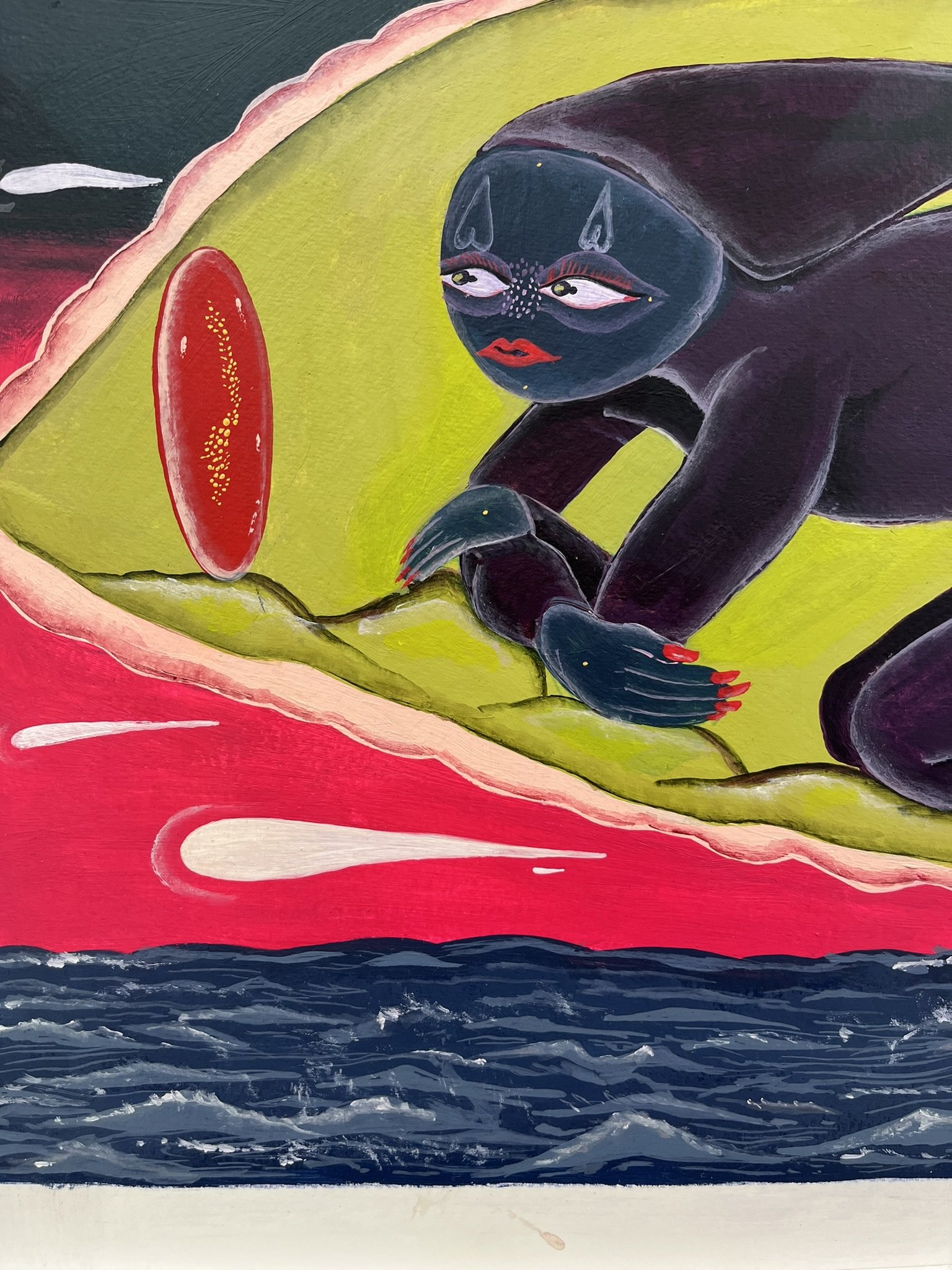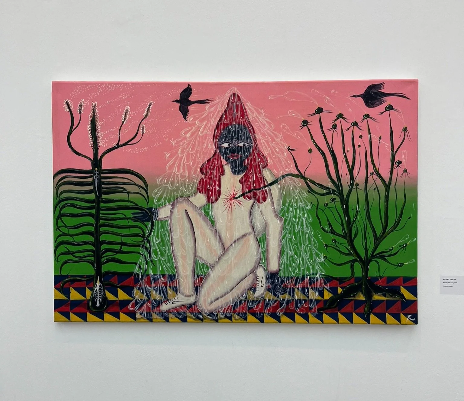 Rithika is an extremely talented artist who I first met during a solo-exhibition at Grosvenor Gallery in 2022. She produces complicated and emotionally charged paintings, which speak of her lived experiences. Rithika exhibits with Chemould CoLab in Mumbai, and this show is held by Sota Marketplace.